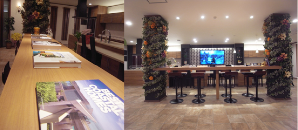 柱を使ったフラワーアレンジメントや大画面での映像を鑑賞しながら、広々したソファーでご自由にお読みいただけるよう、各メーカーのカタログや建築関連図書を多数ご用意しています!!